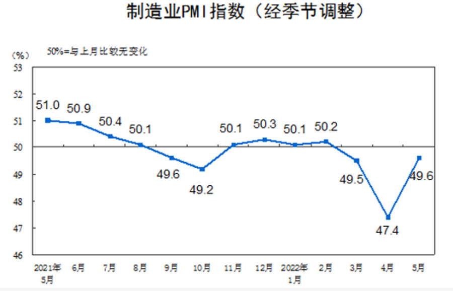 據(jù)國家統(tǒng)計(jì)局、中國物流與采購聯(lián)合會(huì)發(fā)布,2022年5月中國制造業(yè)采購經(jīng)理指數(shù)為49.6%,相較于4月回升2.2%。這表明前期疫情形勢和國際局勢等因素對經(jīng)濟(jì)運(yùn)行造成的較大沖擊,隨著高效統(tǒng)籌疫情防控和經(jīng)濟(jì)社會(huì)發(fā)展逐漸改善。